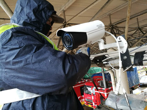 圖為工作人員在調(diào)試攝像頭 為趕在春運前完成這項工作,中心全體隊員克服雨雪天氣帶來的強降溫等困難,兵分四路加班加點,在各收費站內(nèi)外廣場安裝固定云臺攝像機,或半蹲著穿梭于頂棚下方狹隘空間鋪設(shè)線路,或冒雨來回奔波監(jiān)控室與車道間調(diào)試設(shè)備。經(jīng)過連續(xù)幾天的努力,四個站共計10臺“云視頻”監(jiān)控攝像頭已全部安裝調(diào)試完畢。在這過程中,由于天氣惡劣,中心兩位隊員不幸感冒發(fā)燒,其中一位甚至還燒到了近40度,當領(lǐng)導讓其回去好好休息時,他只是輕描淡寫地說了一句:“無大障,睡一覺就好。”