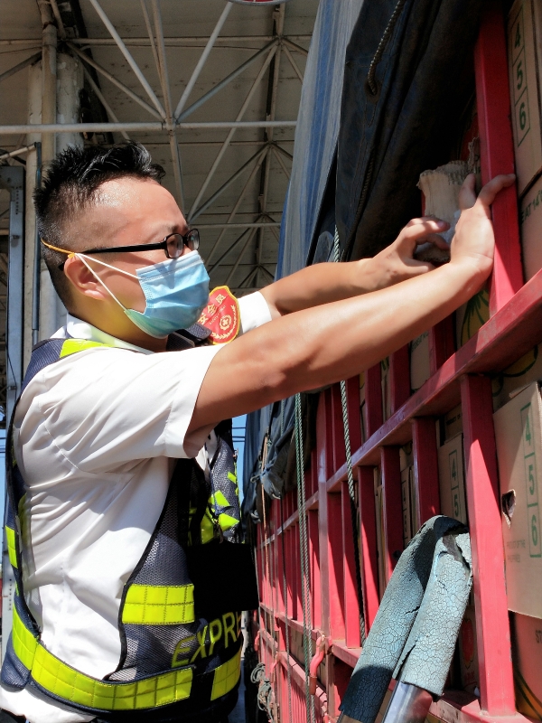 檢查綠農(nóng)車,遇到攀爬驗(yàn)貨時(shí),車輛欄桿因高溫炙烤至少在四五十度以上,臺(tái)州南收費(fèi)所班長(zhǎng)周冬子笑著說(shuō):“現(xiàn)在的車欄桿都‘辣手’了,腳底板也像踩了‘風(fēng)火輪’。” 話音還未落,只見(jiàn)他蹭蹭幾下,已然爬上貨車,一邊檢查貨物一邊用袖子蹭掉臉上豆大的汗珠,被曬得黝黑發(fā)紅的皮膚在烈日下格外醒目。綠農(nóng)車開走后,他顧不上滿身汗水,拿起了掃把開始打掃灑落在車道上的綠農(nóng)產(chǎn)品。因?yàn)樗溃@些灑落的農(nóng)產(chǎn)品,如不及時(shí)清理,在太陽(yáng)曝曬后將會(huì)更加刺鼻,影響收費(fèi)站的形象。 熱浪滾滾,卷不走收費(fèi)員們工作的熱情;夏日炎炎,燃不盡收費(fèi)員們堅(jiān)守的意志。他們用執(zhí)著在高溫下書寫愛(ài)崗敬業(yè),用責(zé)任和擔(dān)當(dāng)保障著高速的平安暢通。 項(xiàng)丹穎