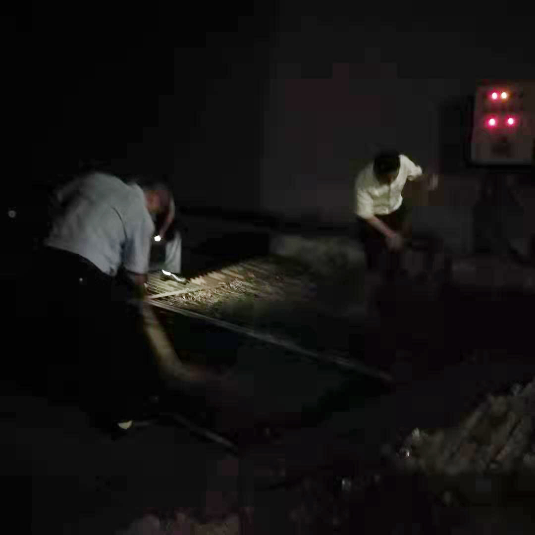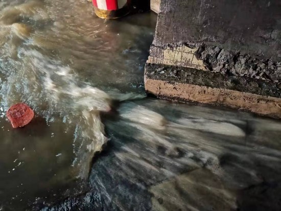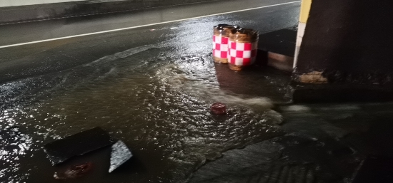 圖為車道水流 當晚19:12分,黃土嶺隧道所中控員徐彤霞發(fā)現(xiàn)寧向隧道主車道路面出現(xiàn)積水,如不及時處置,路面濕滑會讓過往車輛打滑,嚴重影響隧道的安全暢通。為了杜絕安全隱患,管理所立即啟動防汛應(yīng)急方案,中控員第一時間在管理群發(fā)送現(xiàn)場圖片,并在同一時間通知執(zhí)勤隊與監(jiān)控中心。 執(zhí)勤隊員不顧狂風暴雨趕赴現(xiàn)場,19:19分,斜井現(xiàn)場山上倒灌入隧道的水嘩嘩直流,儲水池水流急促,執(zhí)勤隊員立即分工合作,一組在主車道擺放安全錐采取防護措施,并利用沙包,堵住排水溝壁,使水盡量不往外滲,及時避免了積水對隧道內(nèi)行車造成的安全隱患。一組檢查潛水泵是否正常運行,查看積水入侵的原因、排水溝通暢情況。