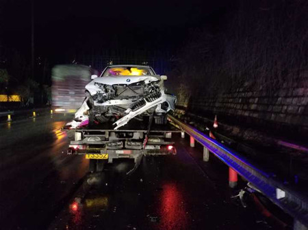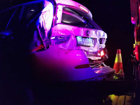 當天18:16分左右,該隧道內還發生了一起嚴重追尾事故,一輛寶馬X3在進入隧道之前由于車速過快避讓不急,狠狠的與前方一輛大貨車發生追尾,被撞得慘不忍睹。所幸車上只有駕駛員一人且系了安全帶并未受傷。