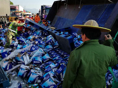8月25日凌晨4點,甬臺溫高速溫向1648+7路段,一輛運啤酒的大貨車因司機疲勞駕駛,導致車輛撞上中央護欄而側翻,啤酒灑滿一地,后方兩輛貨車避讓不及造成多車事故。