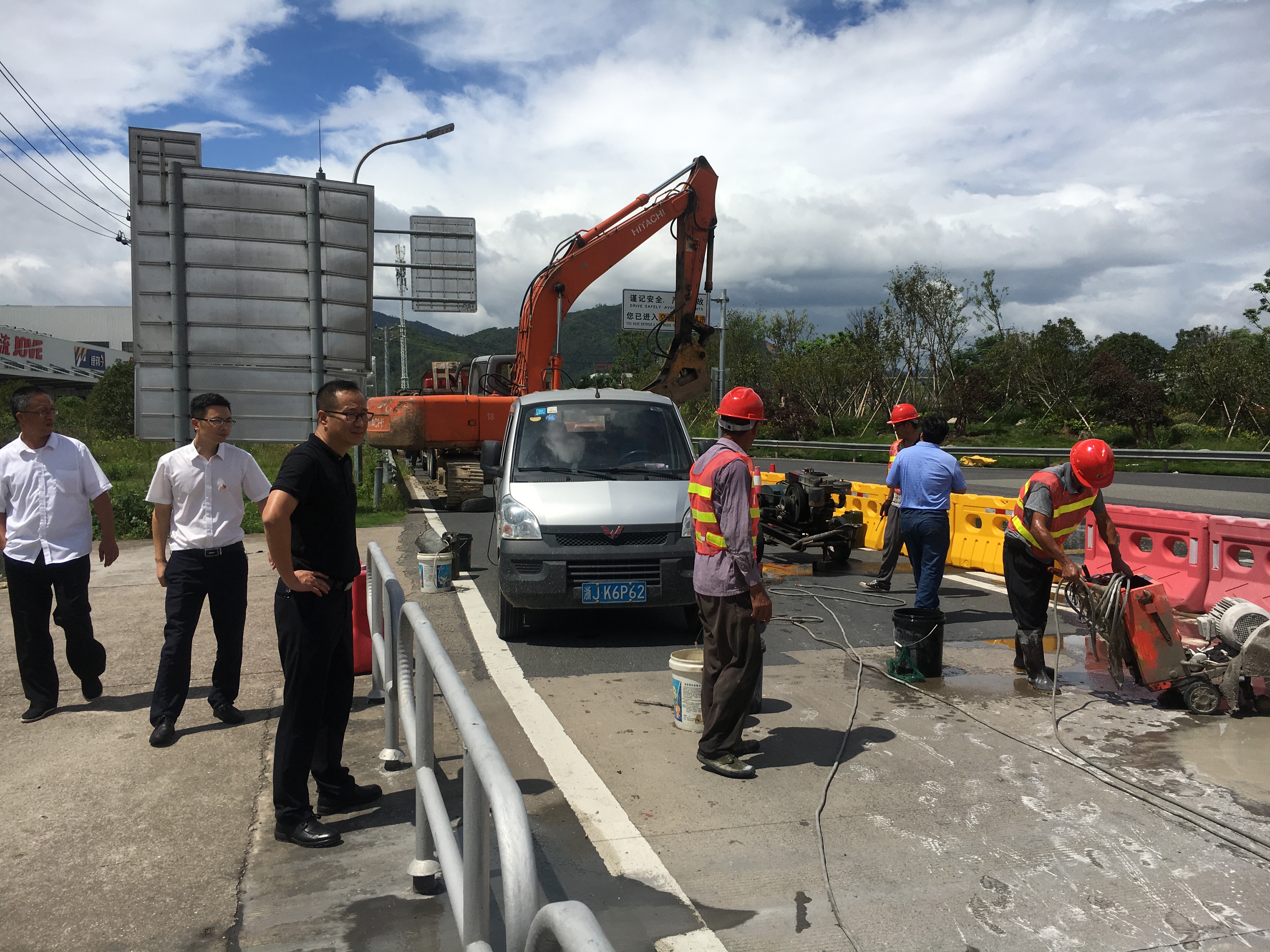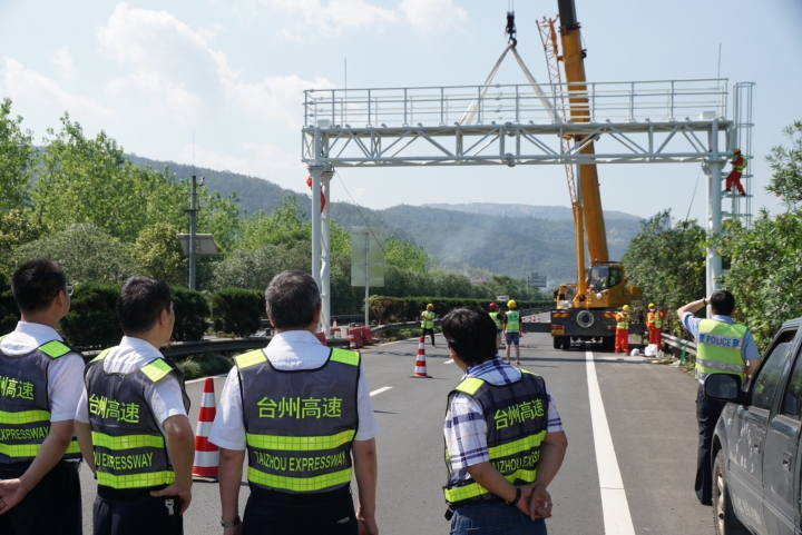 臺州高速完成首個龍門架吊裝 取消省界收費站工作邁出堅實一步 9月7日上午,首個自由流主線虛擬收費站龍門架,在甬臺溫高速公路臺州段溫州方向主線K1668+200M處現(xiàn)場完成吊裝,標志著取消省界收費站工作邁出了堅實的一步。集團董事長、總經(jīng)理陳文波在吊裝施工現(xiàn)場視察指導工作。集團總工程師江輝,高速交警、施工單位、監(jiān)理單位、工程部等人員陪同。
