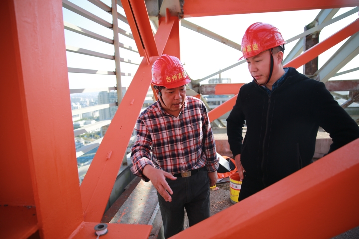 集團安全總監項同富檢查天和大廈除銹施工 11月15日下午,集團安全總監項同富在辦公室、房產公司相關人員的陪同下,到天和大廈樓頂鋼架除銹施工現場檢查施工進展和安全工作。 集團總部天和大廈樓頂鋼架跨度大,高低水平不一致,很難搭建大范圍的防護網及腳手架等施工輔助工具,也無法采用大型機械打磨除銹的方式除去表面的銹層,只能靠手工和電動角磨機除銹。施工人員常常進行高空作業,安全隱患大。