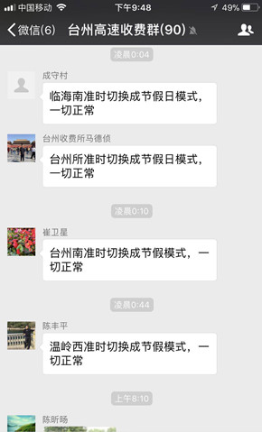 圖為收費模式切換時的微信工作交流群 加強宣傳,主動引車流。集團網站、微信公眾號等媒體提前發布通行提示,解釋國家免費通行政策,引導司乘人員錯峰出行。在各收費所路段進口附近重要岔口提前布置臨時限行指示牌,提醒過往貨車避開高峰時段。高速主線上利用電子顯示屏、可變情報板等手段及時通報路況,引導車輛通行。