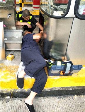 面對新的挑戰,中心隊員毫不畏懼,憑著嫻熟的技能,做網線、接電源、找插板、聯系授權......忙得連喝水時間都沒有,他們或彎腰或半蹲,甚至整個人趴到了地面上就是為了找一根相應的數據線和配置端口。經過共同努力,新架設的收費電腦一次性通過了過車測試,出口車道瞬間增加一個,三車道成了四車道。