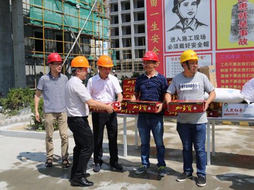 在文鼎苑項目工地現場,羅小將親手把防暑物品遞送給施工人員,對他們在高溫天氣仍然堅守崗位的工作精神表示敬意,并囑咐他們一定做好防暑降溫的防范工作。
