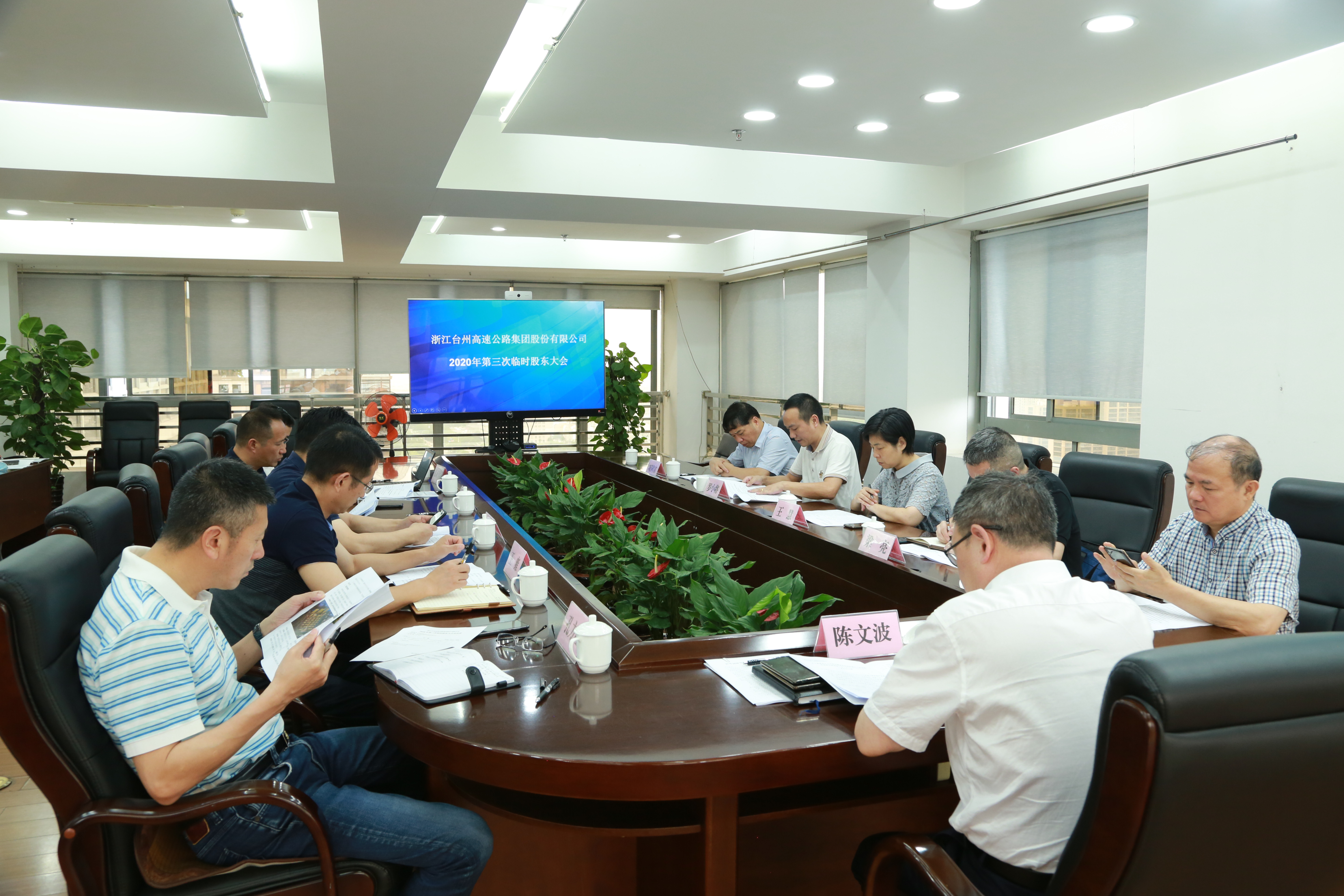 圖為陳文波主持會議 大會由公司黨委書記、董事長、總經理陳文波主持,公司董事、監事和高管人員出席大會。 大會經鼓掌表決推舉了監票人、計票人,經記名投票表決通過《關于高速房產公司參與黃巖區東城街道印山路西側、二環南路北側地塊(臺土告字[2020]028號)競拍的議案》。本次股東大會各項議案均獲通過,同意各項議案的表決股數占出席會議所有股東所持表決權的100%。
