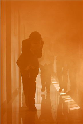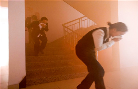 該演練模擬了生活樓發生火災,員工發現火情立即撥打報警電話參加演練人員聽到警報聲,迅速拿起打濕的毛巾捂住口鼻,手扶墻體或樓梯扶手,俯身低姿從三樓或二樓,向安全通道有序撤離。全體人員不一會就疏散到了安全地帶,同時連接好消防水帶,迅速跑至火源附近對準火源有效滅火。