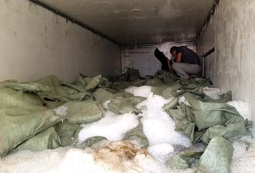 李貴陽打開車輛后廂門,迎面撲來一陣?yán)滹L(fēng),一眼望去車廂里面全部是一袋袋的花蛤,上面還壓著袋裝的冰塊和零碎的碎冰,車廂內(nèi)部看不清楚。憑借多年的工作經(jīng)驗和認真負責(zé)的工作態(tài)度,李貴陽二話沒說,直接爬上濕滑的車廂,踏過冰袋和碎冰,深入到車廂里面去檢查,把冰袋掀開后,結(jié)果發(fā)現(xiàn)下面全部是空桶。原來這樣做既可以增加貨物面積也可以使重量加重,從而達到綠農(nóng)政策的免費通行要求。