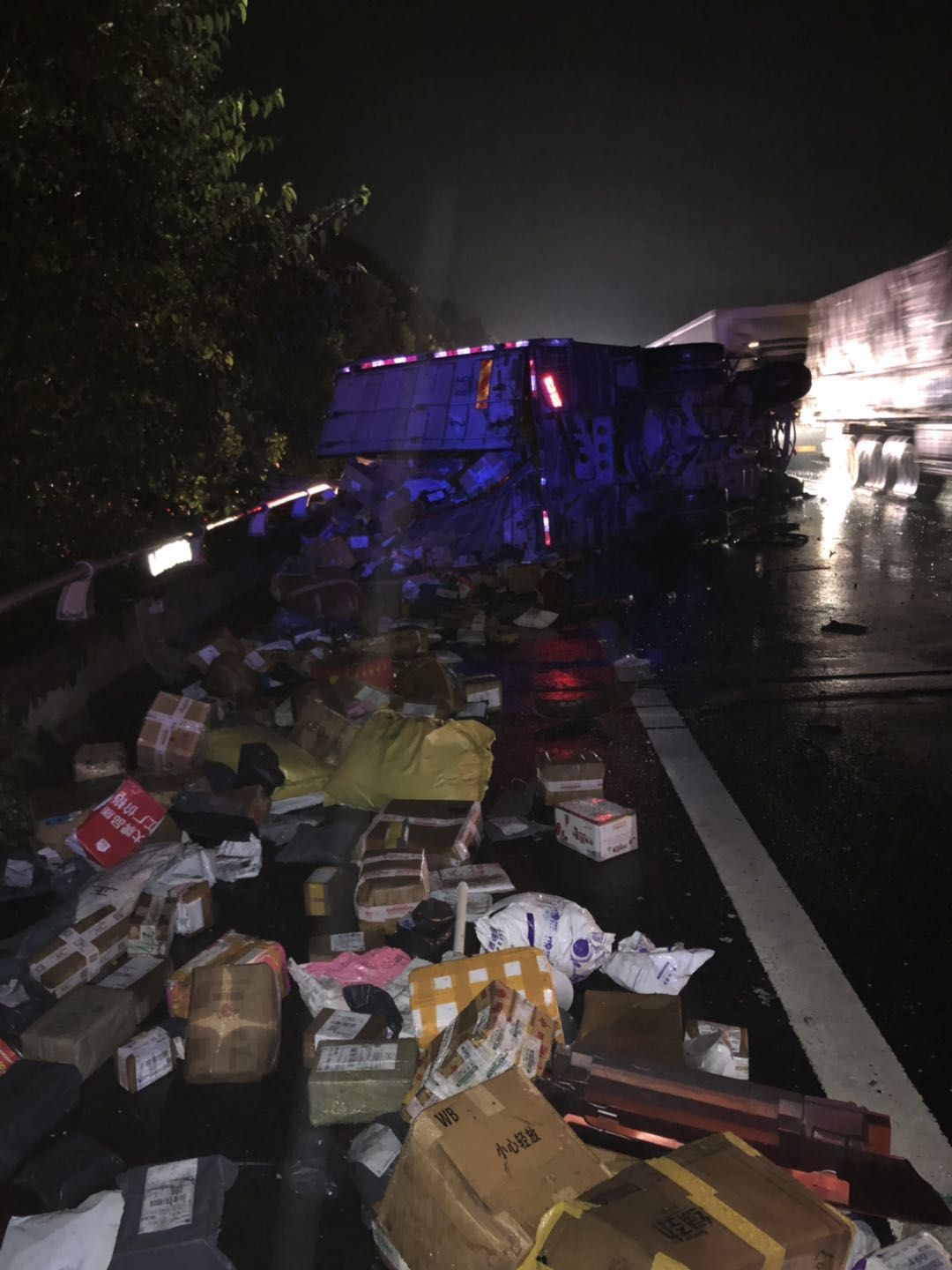 7月14日凌晨1點(diǎn),溫州方臺(tái)州南收費(fèi)所附近一輛半掛型大貨車和一輛快遞車相撞,半掛車直接沖出高速,四腳朝天。快遞車則是被巨大的沖擊力撞向了硬路肩,側(cè)翻中撒下數(shù)十米的貨物。1點(diǎn)10分,救援車輛到達(dá)現(xiàn)場(chǎng),現(xiàn)場(chǎng)一片狼藉,防撞護(hù)欄板、護(hù)欄柱損傷嚴(yán)重,橋梁鋼管都折斷了不少。