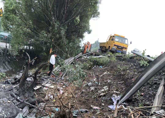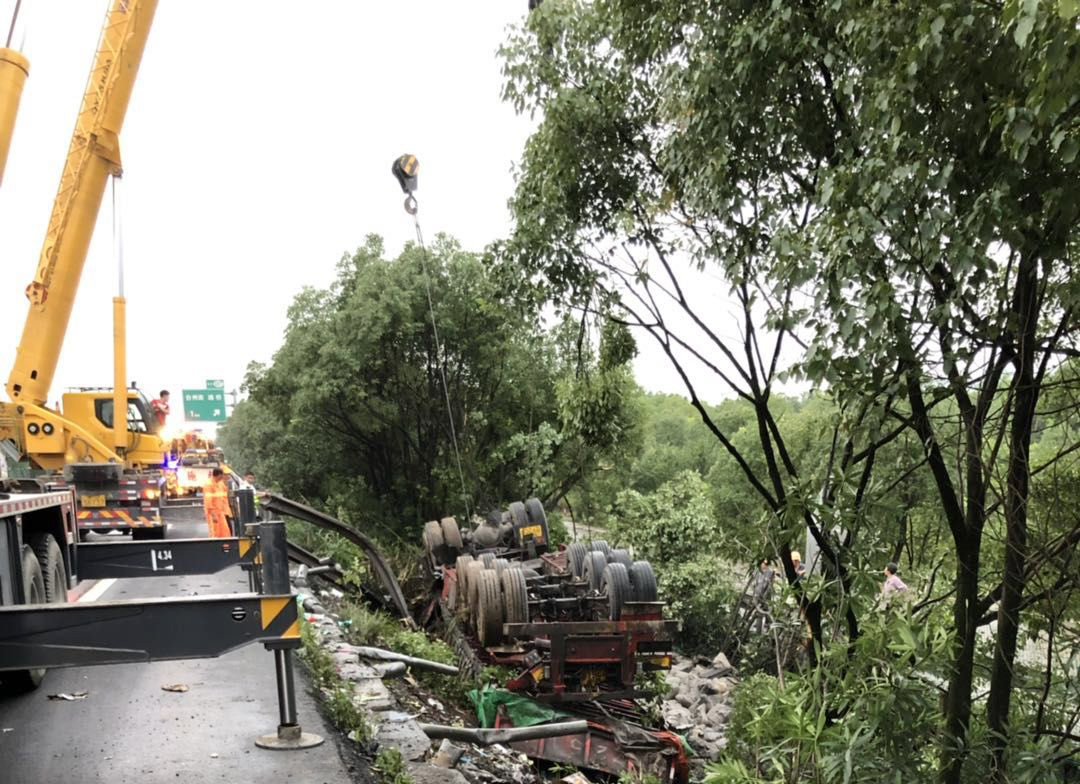 7月15日上午,臺(tái)州高速集團(tuán)施救中心輔查員和駕駛員在核對(duì)路產(chǎn)損失。這是他們第三次到事故現(xiàn)場(chǎng)進(jìn)行路產(chǎn)勘查。