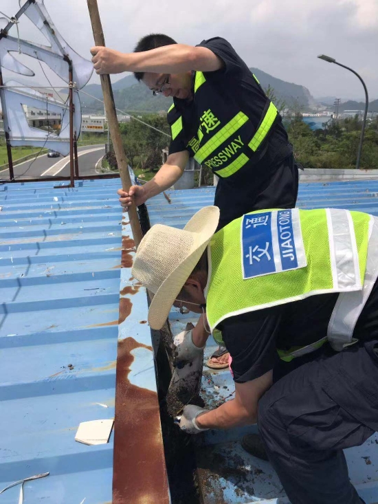 全面清除收費頂棚及下水管道垃圾。集團沿線收費頂棚經過幾次的施工裝修,遺留了一些裝飾垃圾,如不及時清理一旦掉入排水溝或下水管道,勢必會造成頂棚漏水,影響下面人員及設備安全。8月7日,維養中心組織班員在登高車協助下,頂著炎炎烈日,利用垃圾夾、鐵鍬等工具對沿線收費站收費頂棚上方垃圾、排水溝中的淤泥進行了逐一清理,并重新鋪設排水溝上面的防護網,防止臺風期間吹來的一些塑料紙袋等輕型垃圾再次堵塞下水道。