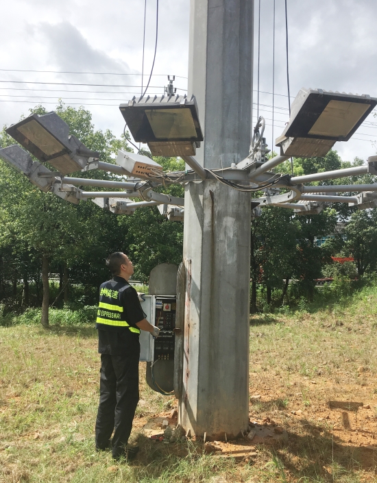 及時下降各收費所互通區高桿燈。為提升互通區照明亮度,減少因選錯路口而帶來的不必要的麻煩,集團在各收費站出入口互通區共安裝了11盞40米高度高桿燈,每盞高桿燈上方有12盞鈉燈。倘若這些高桿燈上鈉燈在臺風襲擊下一旦掉落后果將不勘設想。8月8日,中心再次召集各班人員對收費沿線高桿燈進行了下降處理。因高桿燈四周雜草叢生,在下降時維修隊員不僅要忍受底下蚊蟲肆意叮咬,還要克服時而烈日時而大雨的怪異天氣,沒放幾盞隊員便濕透了全身,衣服是濕了又干,干了再濕。