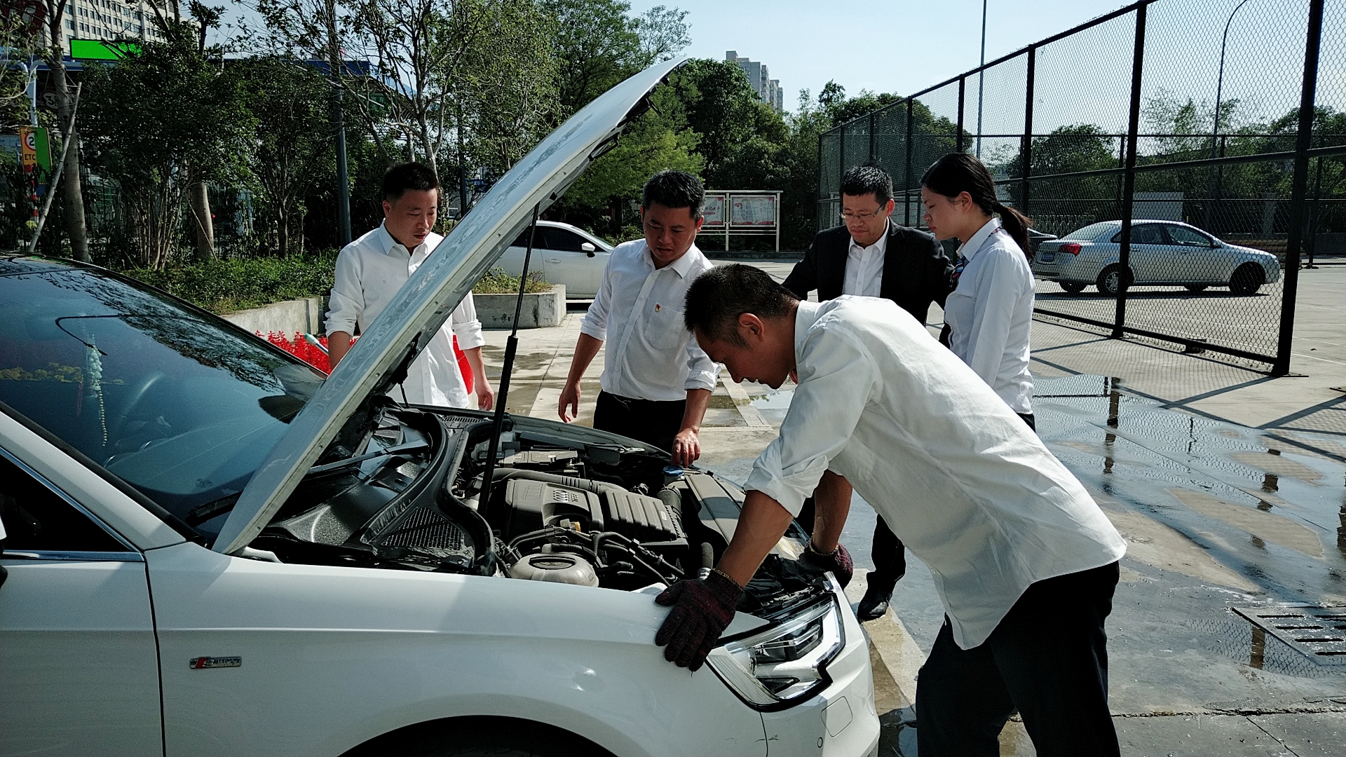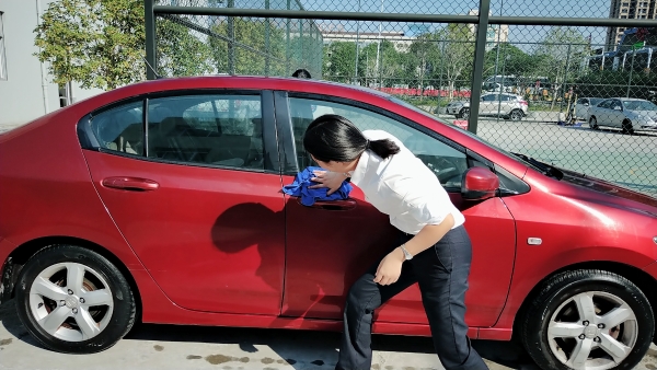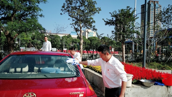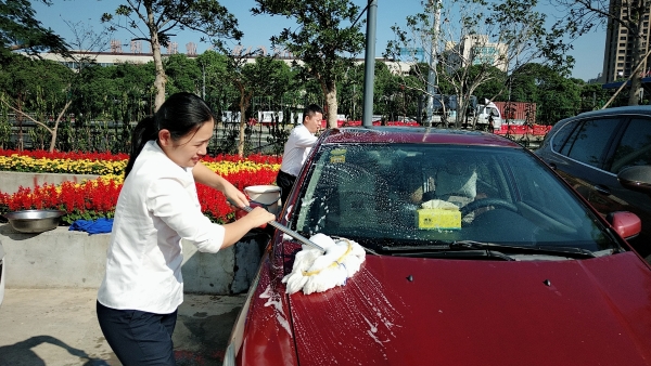 當天上午,活動一開始,前來洗車的車輛絡繹不絕。在支部書記周超的帶領下,五名黨員便開始分工合作。兩名男同志負責沖水、上泡沫、擦洗、再沖水,兩名女同志負責擦干和吸塵器清掃內室,還有一名男同志負責開車挪車,需要清洗的車輛一輛接著一輛,黨員同志們顧不得擦干身上的被水濺濕了的衣服,忙得不亦樂乎。看著被洗得一塵不染的車,大家都不約而同地會心一笑。