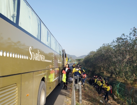 面對這群特殊的“客人”,輔查員王凱迅速擺起隔離裝置,并再三叮囑學生,一定要呆在硬路肩外面,不能隨意走動,同時告訴老師們要注意過往車輛,看好學生,做好安撫工作。
