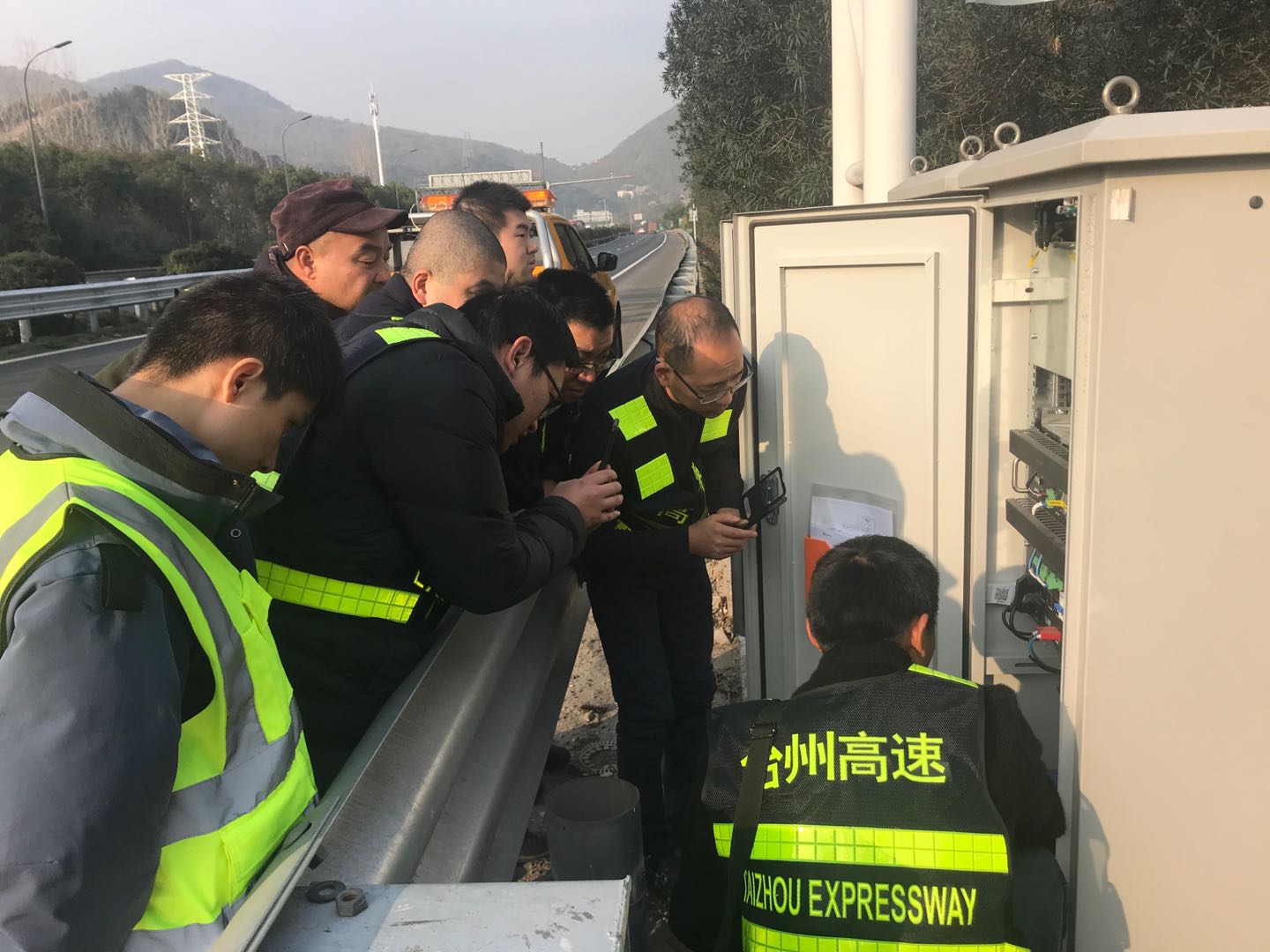 上完理論課,在中心負責人帶領下,所有參訓人員來到了寧向路面的一個門架監測點,大家根據剛才所學知識點,摸擬非正常斷電時設備切換操作流程以及當設備發生故障時如何快速恢復進行逐一演練,并對操作中存在疑惑地方及時向廠家人員尋求幫助,切實做到學懂弄通做實。