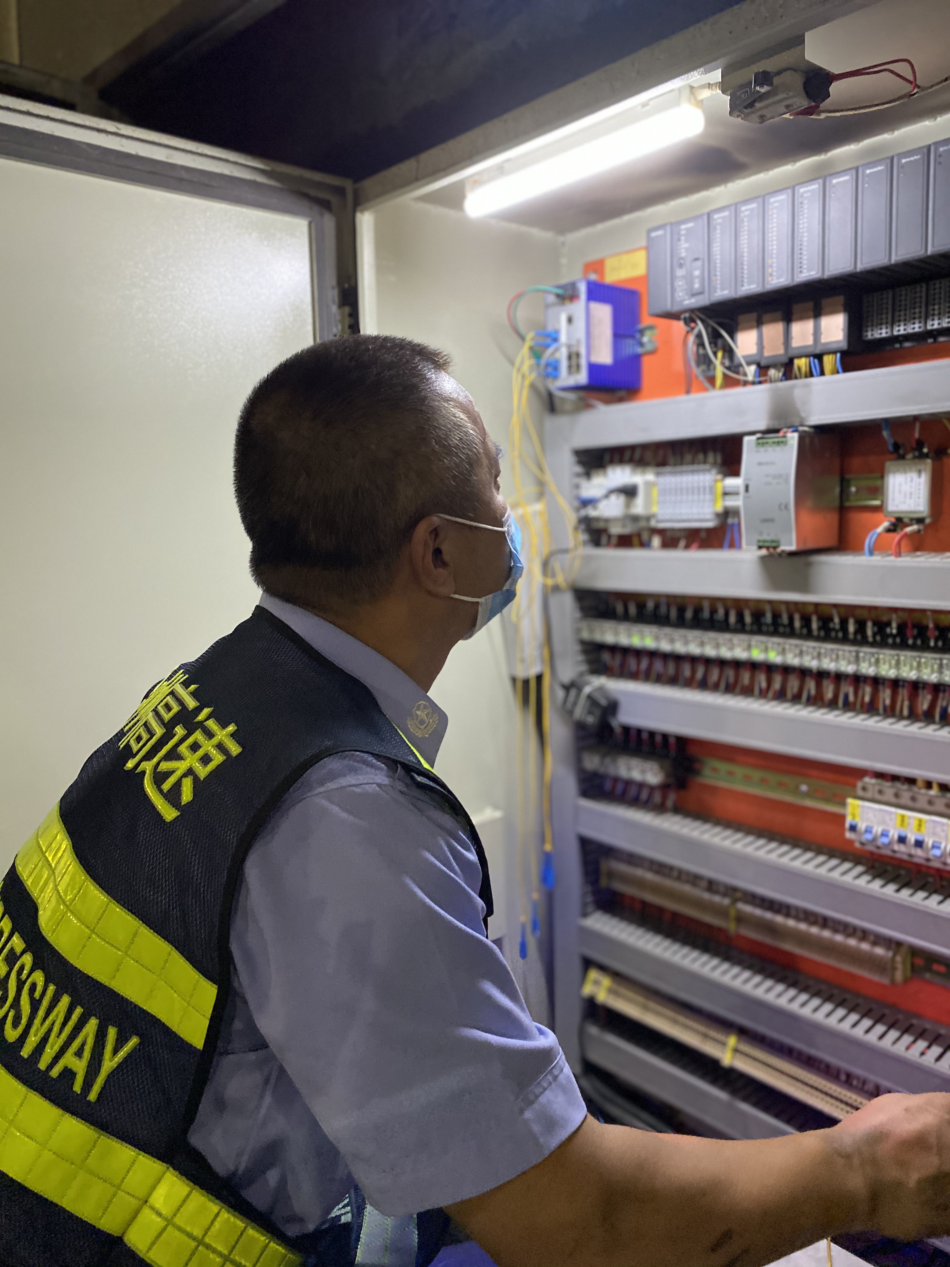 雖然隧道內沒有烈日的灼燒,但日均4萬的車流,加上尾氣排放,導致隧道內的氣溫遠高于室外。當室外37°C時,整個隧道里宛如一個蒸籠。盡管如此,廣場上、電纜溝上隨時都有執勤隊員忙碌的身影。他們來回徒步穿梭隧道,檢查指示燈、消防設備箱、緊急電話、火災報警等設施設備,排查各類安全隱患,修復受損設備,處理各種突發情況。一趟下來臉和胳膊被得黝黑,口罩、衣服濕了又干、干了又濕,盡管工作量大、強度高,他們從不喊苦說累。