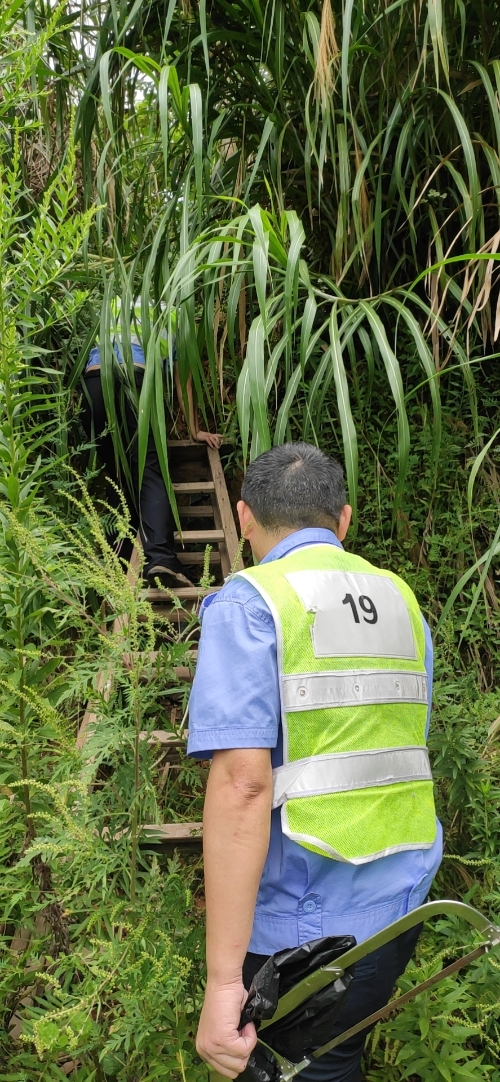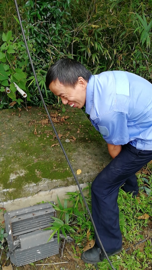 為保障隧道消防安全,中控對消防水池的水位需時時關注,萬一水池漏水無法及時查看,如遇火災,消防水供應不上,后果不堪設想。隊長意識到事情的嚴重性,即刻安排電工湯寧光和陳幸趕往北面山上的高位水池位置。初秋的山上植物茂盛,原來通往水池的小路早已淹沒在雜草間,隊員們提著工具憑著記憶找小路,單手撥開雜草往山上走,到達高位水池之后,他們分工協作一邊檢查線路,一邊抬開井蓋水池檢查照明燈,經過檢查后發現只是線路有點松動,陳幸馬上對線路進行加固。