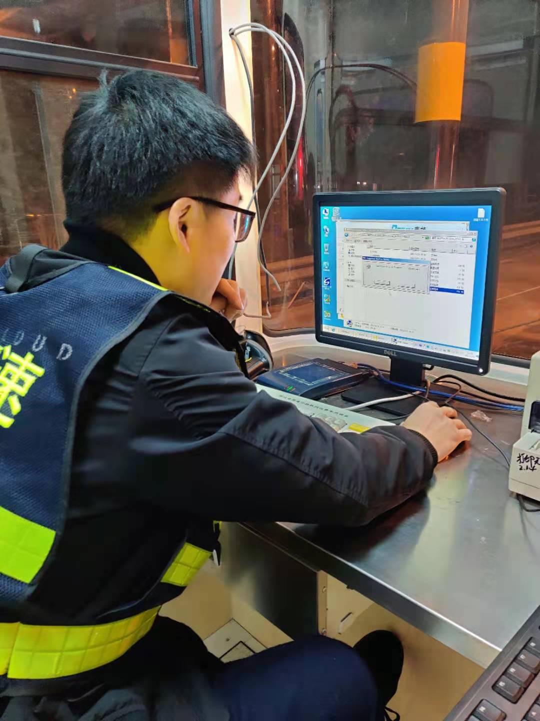 22日一早,中心電工配合廠家人員在車道繼續(xù)查線、接線,安裝崗亭的基礎設備,系統(tǒng)員則在機房負責安裝新電腦的收費系統(tǒng)及相關(guān)設備驅(qū)動。大家各司其職、各盡其責,僅一天時間就將近百線纜一一對應并成功與外圍設備對接,與此同時,系統(tǒng)員也恢復了原電腦中的數(shù)據(jù)并成功導入到新電腦中,避免了數(shù)據(jù)中斷。在修復過程中,搶修人員也曾遭遇各種困難,有些設備安裝需要專用工具,部分零散配件、電源等一般商鋪都沒有供應,但這些并沒有難倒他們,而是利用各自資源,跑遍了市區(qū)的大街小巷,或借或買,最后都被一一解決。