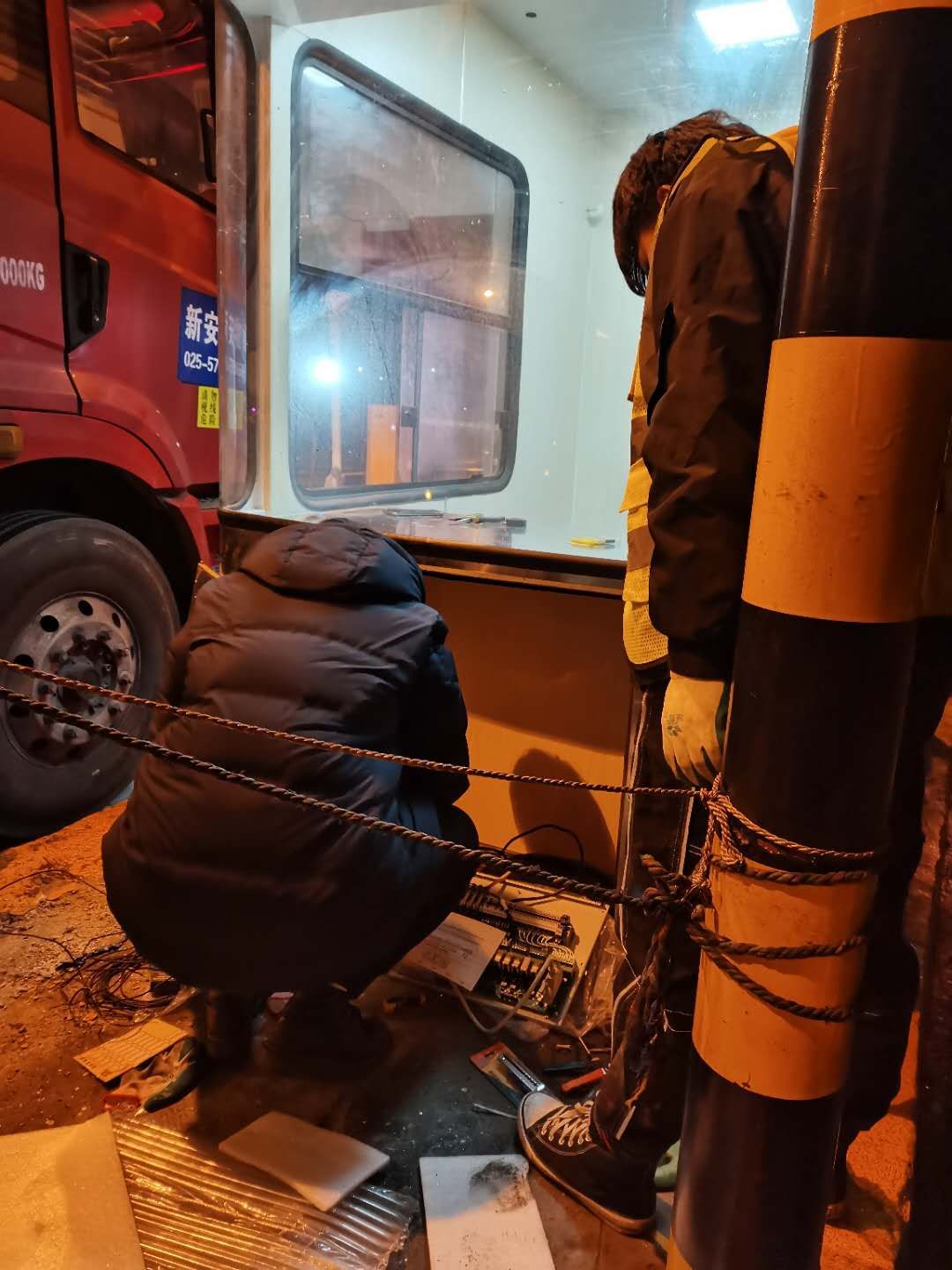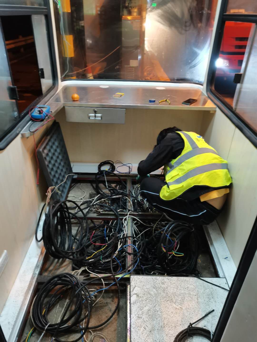 21日下午4點左右,訂購的新崗亭和損壞的設備設施陸續(xù)到位,中心值班人員協(xié)同設備廠家一起將其安放并固定至車道原位置。因崗亭傾倒時拉斷了底下很多線纜,在拆除設備時又因為緊急搶修需要沒有作相應標注,現(xiàn)場各種電線接頭雜亂如麻。考慮到夜間查線、接線存在一定安全隱患也不利于施工,搶修人員決定第二天再戰(zhàn)。