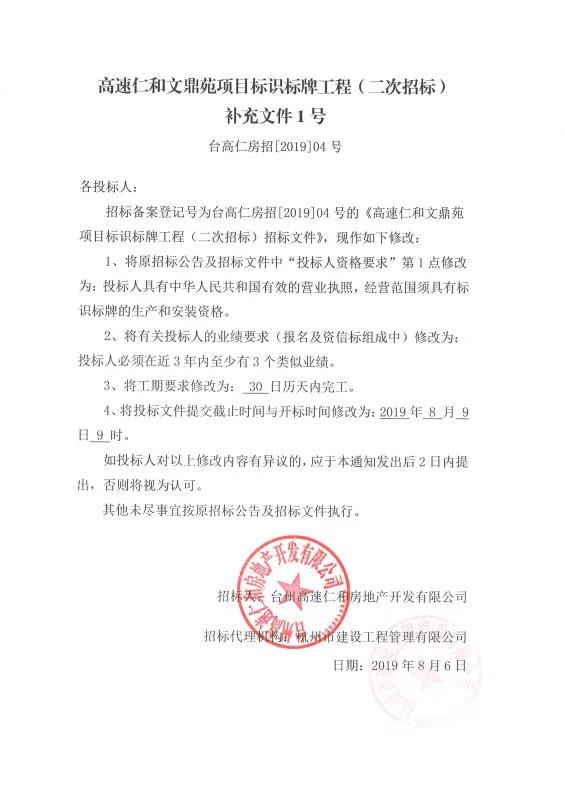 高速仁和文鼎苑項目標識標牌工程(二次招標)補充文件1號