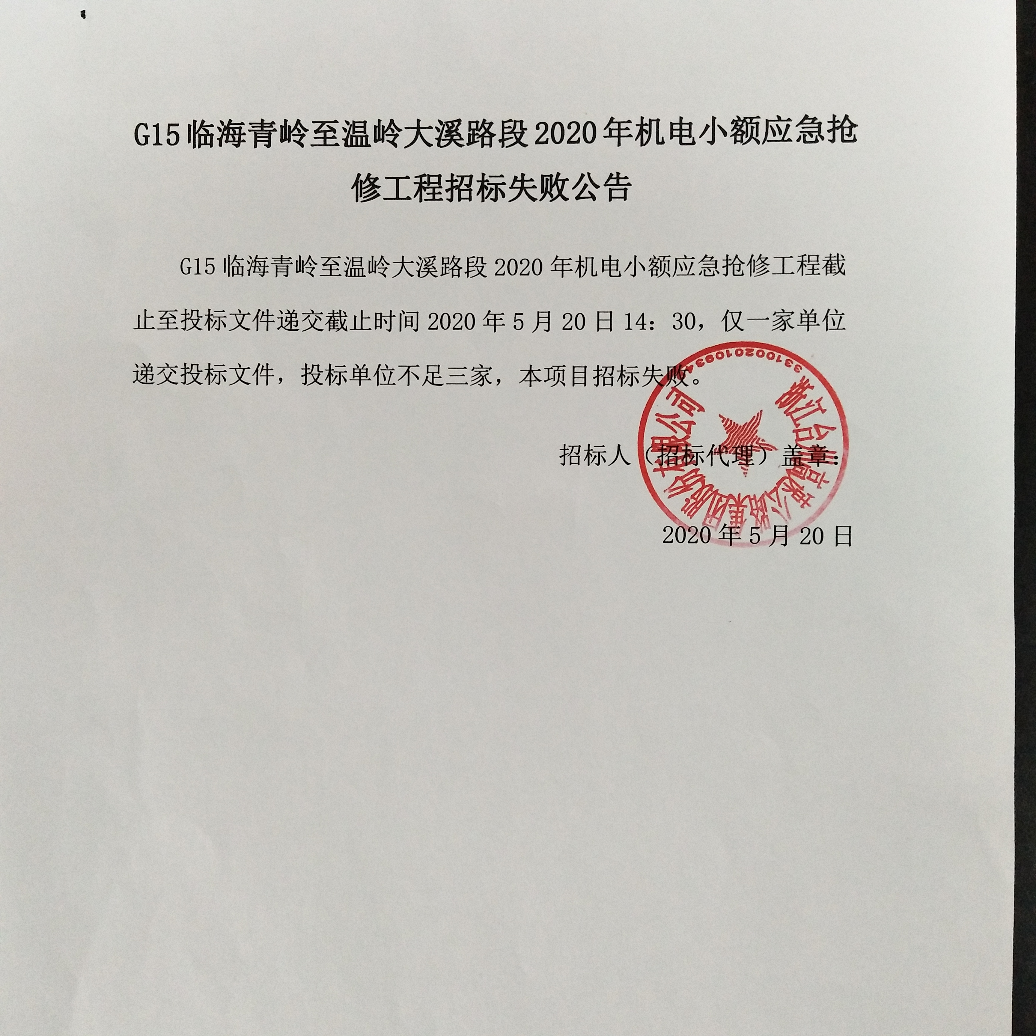 G15臨海青嶺至溫嶺大溪路段2020年機電小額應急搶修工程招標失敗公告