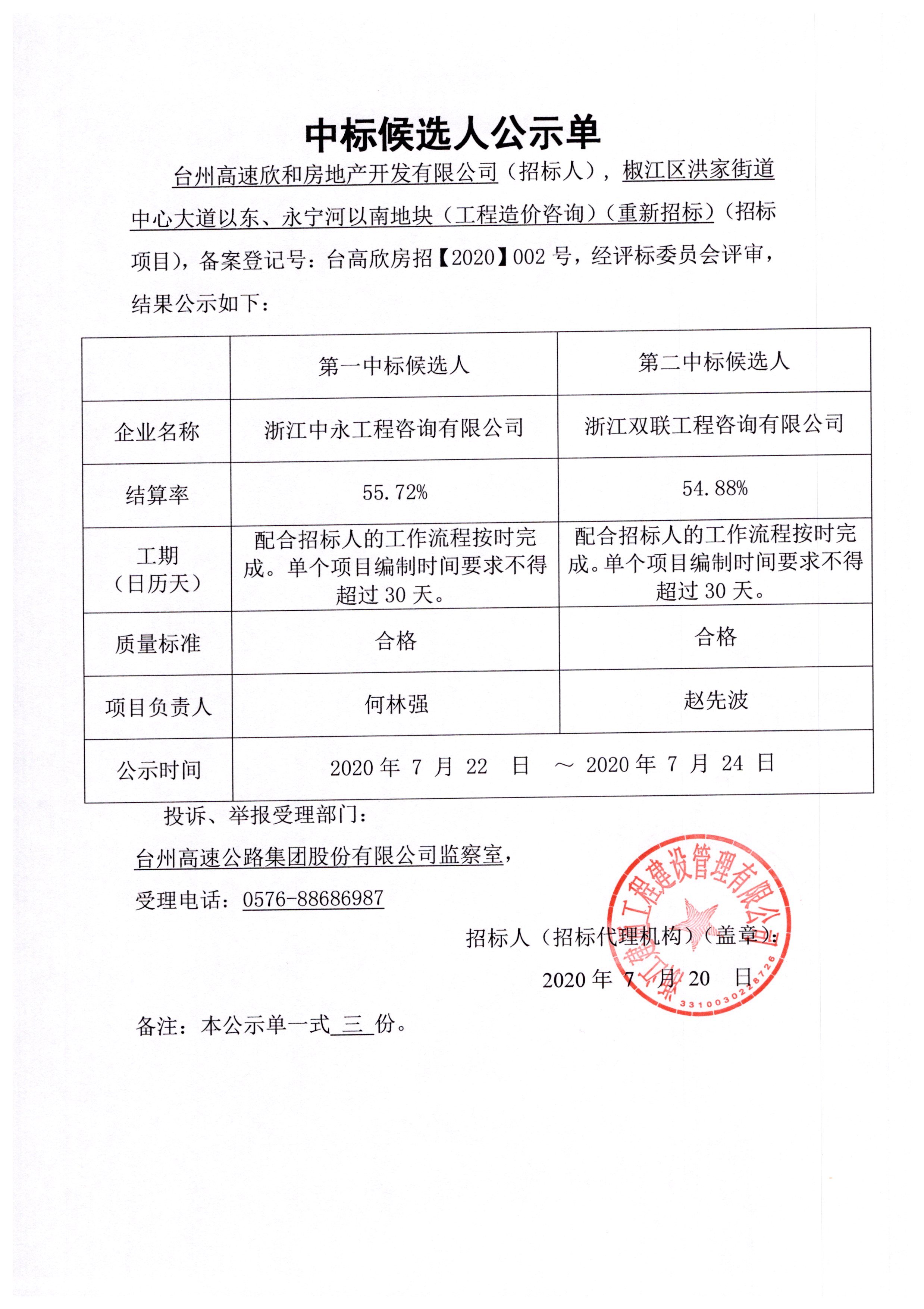 椒江區(qū)洪家街道中心大道以東、永寧河以南地塊(工程造價咨詢)中標(biāo)候選人公示單