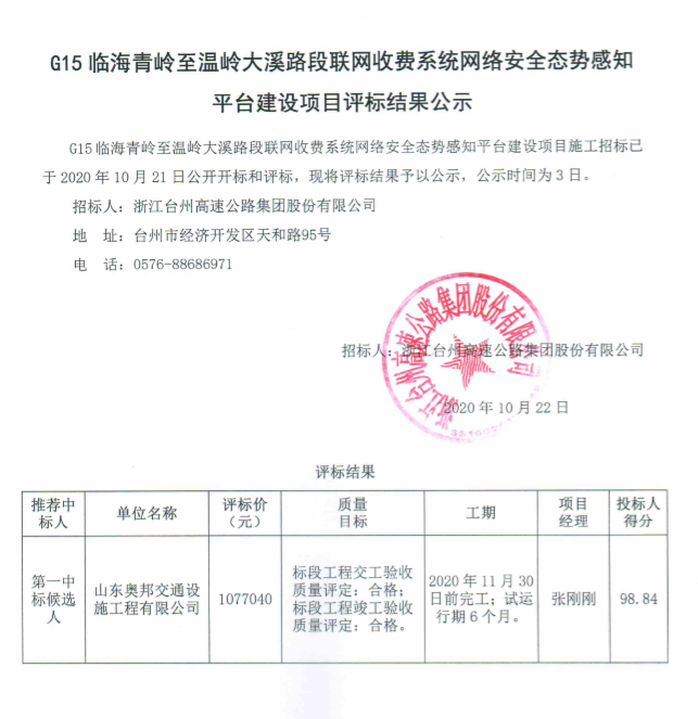 G15臨海青嶺至溫嶺大溪路段聯網收費系統網絡安全態勢感知平臺建設項目評標結果公示