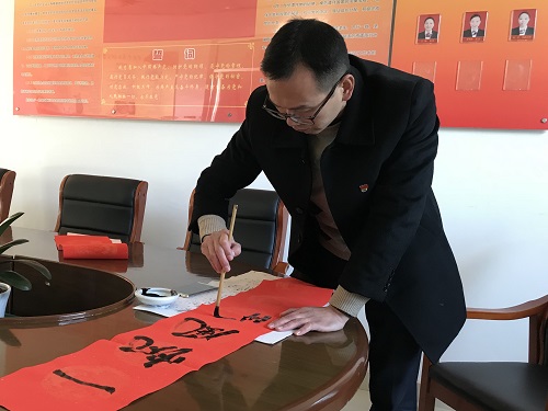 上聯(lián)“自強不息吉慶到”、下聯(lián)“厚德載物福運來”,橫批“喜迎新春”,個個遒勁有力的大字從筆尖輕快地躍出,行云流水的書法讓在場人員無不拍手叫好。所長孫明偉亮出絕活,揮毫潑墨,豪邁大氣地?fù)]寫著一幅幅春聯(lián)。