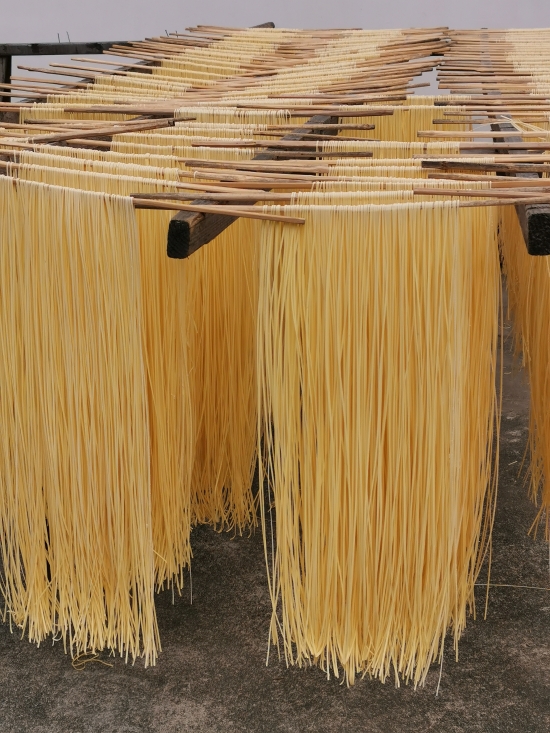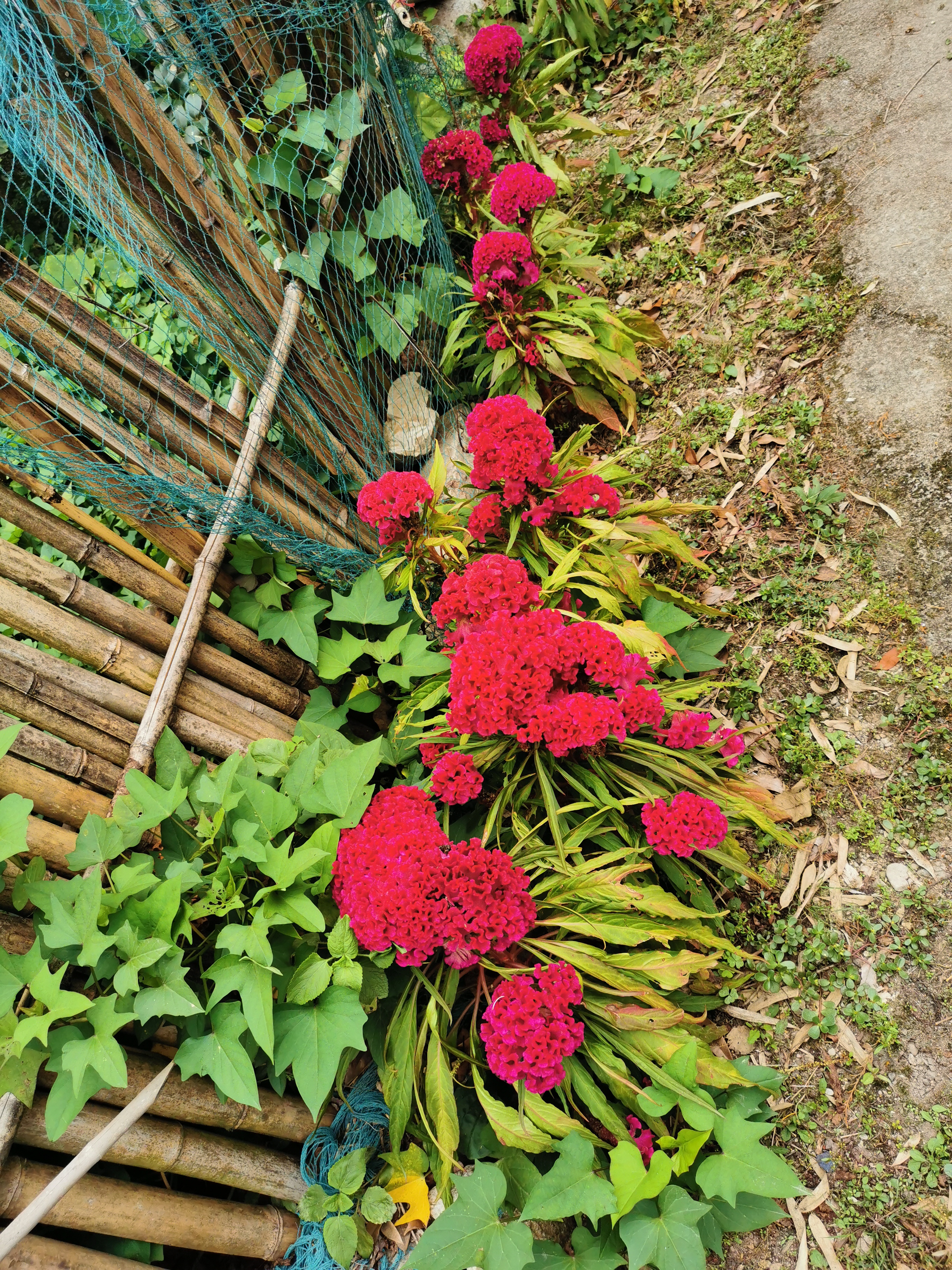 我們沿著村道邊走邊看,隨處可見生命力旺盛的花和樹,尤其是桂花樹見多,最可愛的是村里的旺財(大狗)非常好客,自我們下車便一路跟隨,就好像是在歡迎我們遠道而來的客人,又好像是一個盡忠盡職的保鏢一路護送我們。當我們走進位于小山頭的老村,只見石頭墻上爬滿了青苔,一種蕨類植物頑強地扎根,努力地活著,老房子就這么靜靜地度過每個日出日落,一對老夫妻在門口編織竹籃,此時此景讓我恍惚感覺自己進入世外桃源,這里沒有喧囂的汽車,沒有渾濁的空氣,一切是那么的美好!