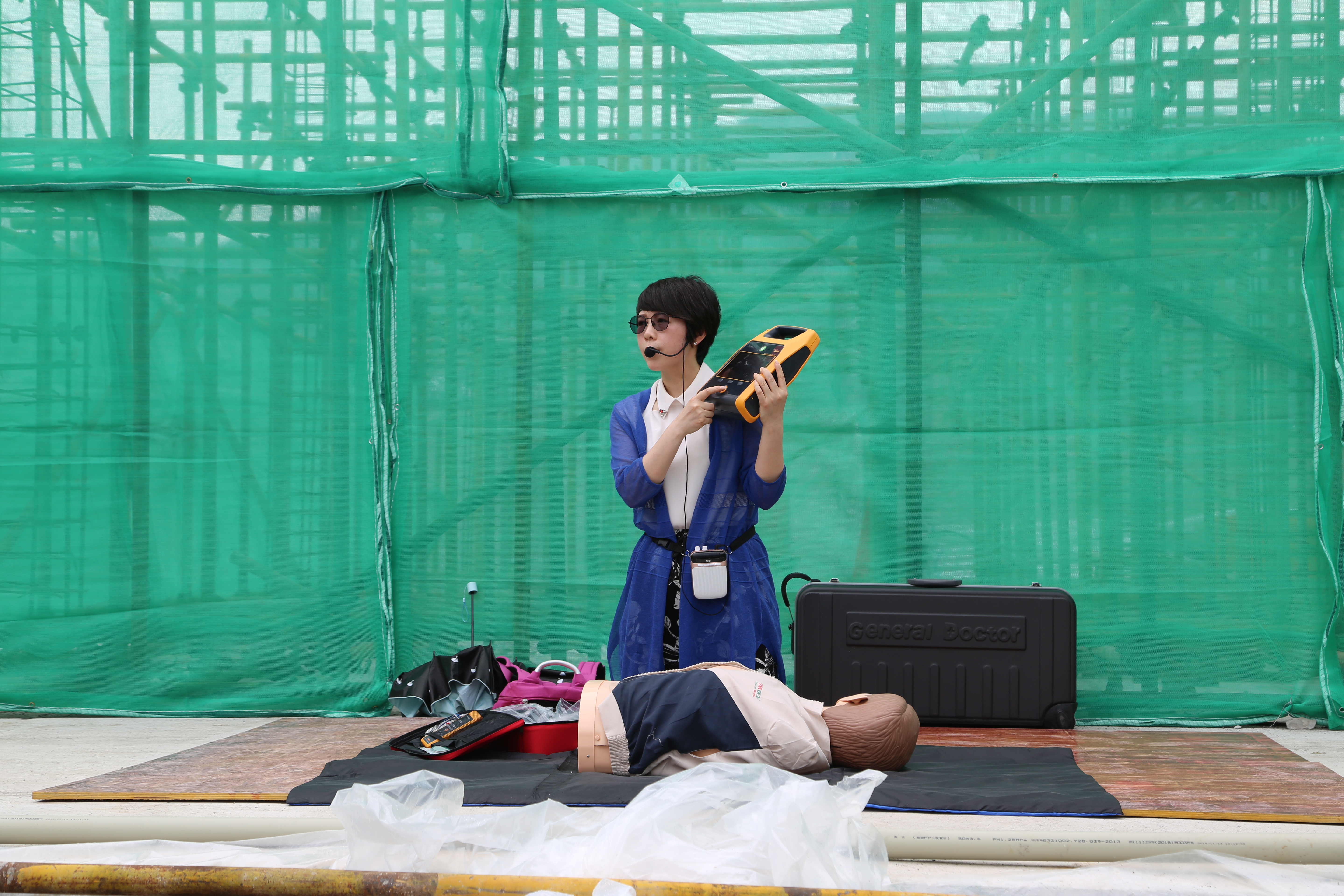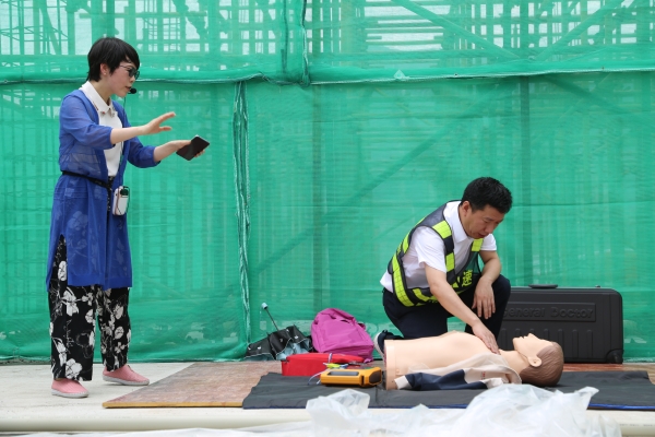 此次演練的第二項重頭戲是心肺復蘇術培訓,建筑工地多為臨時工棚且露天作業,受臺風影響較大,心肺復蘇對于遭遇意外的施工人員來說如同救命稻草。高速集團安保部邀請了臺州職業技術學院副教授李美芬到演練現場進行心肺復蘇術培訓,李美芬詳細講解了心肺復蘇術和AED的理論知識、操作要領和具體方法,并規范熟練地進行了現場演示。隨后參與演練的各部門代表上臺學習實操,李美芬細心指導每一個動作,耐心講解每一個要點,教學效果顯著,有效提高了參演人員的急救技能。