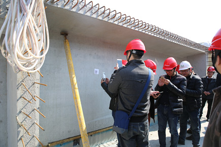在該項目三分部鋼筋加工廠和T梁預制廠的現場,騰達建設集團公司副總經理蔣冬湖向來訪者詳細講解了鋼筋標準化制作工藝、智能彎箍住焊接機、箱式梯籠、智能噴淋養護等施工特色及亮點,并現場向觀摩人員展示了施工全過程二維碼控制,只要用掃一掃構件上的二維碼,該構件所有相關的施工信息馬上就能一目了然的在手機上呈現,實現了施工過程中的信息化管理及全過程監控。觀摩人員一邊認真聽介紹,一邊不時拿起手機拍攝記錄下一些自己感興趣的突破資料,并與同行不斷交流著各自的經驗與心得。