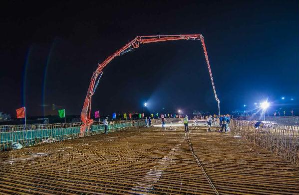 圖為4月21日凌晨,內(nèi)環(huán)路8#立交第二聯(lián)箱梁頂板澆筑場(chǎng)景。鐘 彪攝
